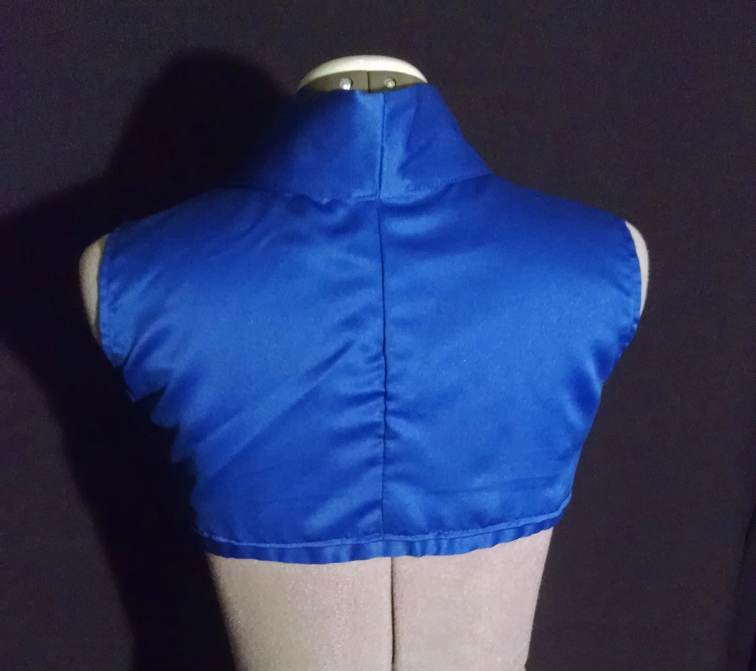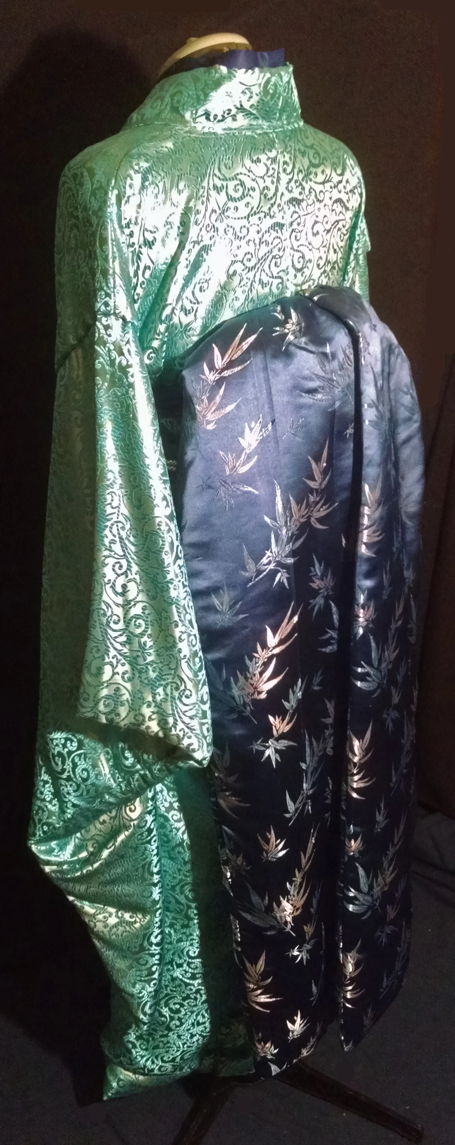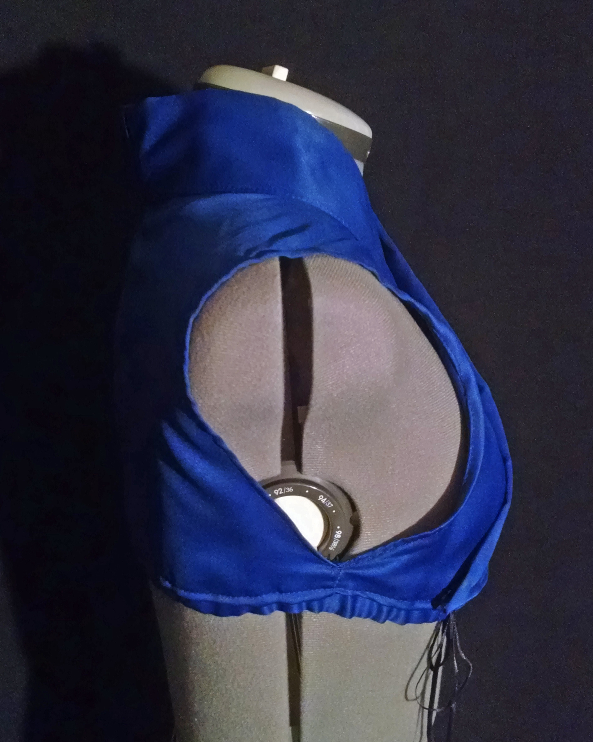 Materials: aqua/dk. blue polyester brocade, dk. blue polyester lining, lt. blue polyester lining, silver rope, cardboard, polyester batting, 1/8" dk. blue ribbon